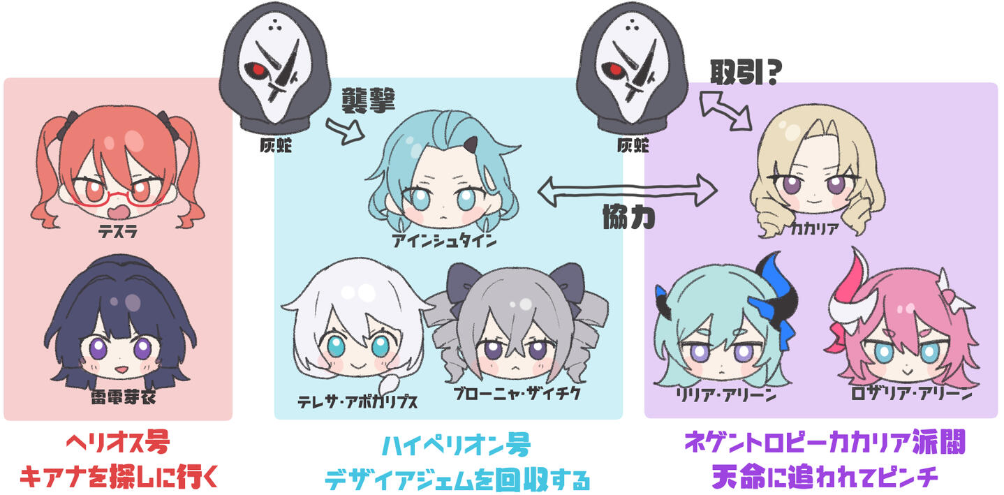 Chapter7で天命本部に武装して乗り込み反逆者となったテレサ達ハイペリオン陣営は、天命本部から撤退したあとも天命本部(オットー陣営)に追われていたため姿を隠していたChapter9から4か月経ったある日、空の律者(キアナ)の目撃情報が灰蛇という情報屋から両陣営に提供されたため、同時に天穿市に到着したこの章は場面の切り替わりがわかりにくいので正しい時系列に整理します